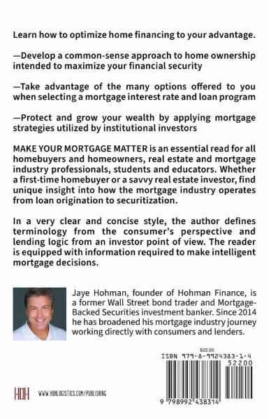 Learn how to optimize home financing to your advantage. -Develop a common-sense approach to home ownership intended to maximize your financial security -Take advantage of the many options offered to you when selecting a mortgage interest rate and loan program -Protect and grow your wealth by applying mortgage strategies utilized by institutional investors MAKE YOUR MORTGAGE MATTER is an essential read for all homebuyers and homeowners, real estate and mortgage industry professionals, students and educators. Whether a first-time homebuyer or a savvy real estate investor, find unique insight into how the mortgage industry operates from loan origination to securitization. In a very clear and concise style, the author defines terminology from the consumer's perspective and lending logic from an investor point of view. The reader is equipped with information required to make intelligent mortgage decisions. Be first to discover my new book empowering homebuyers and homeowners to make smart mortgage decisions!