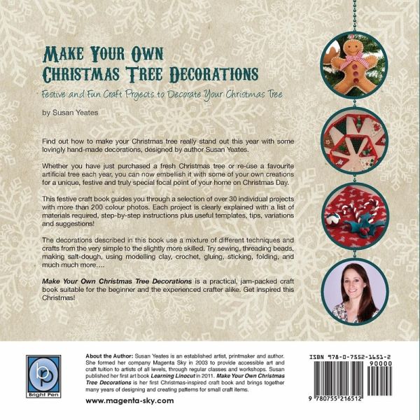 Find out how to make your Christmas tree really stand out this year with some lovingly hand-made decorations, designed by author Susan Yeates. Whether you have just purchased a fresh Christmas tree or re-use a favourite artificial tree each year, you can now embellish it with some of your own creations for a unique, festive and truly special focal point of your home on Christmas Day. This festive craft book guides you through a selection of over 30 individual projects with more than 200 colour photos. Each project is clearly explained with a list of materials required, step-by-step instructions plus useful templates, tips, variations and suggestions! The decorations described in this book use a mixture of different techniques and crafts from the very simple to the slightly more skilled. Try sewing, threading beads, making salt-dough, using modelling clay, crochet, gluing, sticking, folding, and much much more... Make Your Own Christmas Tree Decorations is a practical, jam-packed craft book suitable for the beginner and the experienced crafter alike. Get inspired this Christmas!