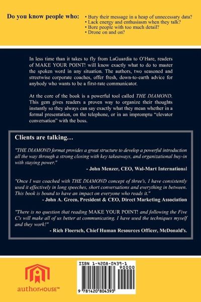 In less time than it takes to fly from LaGuardia to O'Hare, readers of Make Your Point! will know exactly what to do to speak clearly and concisely anyplace, anytime. This is a wise and witty book everyone in business should read. At the core of the book is a powerful tool called THE DIAMOND. This gem will give readers a simple way to instantly organize their thoughts so they'll always be able to convey exactly what they mean. THE DIAMOND format will work whether the reader has to give a formal presentation, talk on a conference call, leave an important voicemail or is caught in an impromptu "elevator conversation" with the boss. Most books written about communication skills tend to be hard-to-digest, wordy manuals. Make Your Point! stands above the rest because it's a quick read that's loaded with lots of user friendly ideas and numerous real-world anecdotes. If you need to improve your message or your delivery, this book is for you.