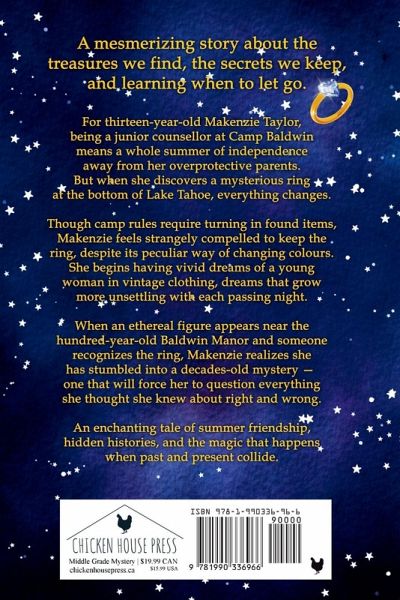A mesmerizing story about the treasures we find, the secrets we keep, and learning when to let go. For thirteen-year-old Makenzie Taylor, being a junior counsellor at Camp Baldwin means a whole summer of independence away from her overprotective parents. But when she discovers a mysterious ring at the bottom of Lake Tahoe, everything changes. Though camp rules require turning in found items, Makenzie feels strangely compelled to keep the ring, despite its peculiar way of changing colours. She begins having vivid dreams of a young woman in vintage clothing, dreams that grow more unsettling with each passing night. When an ethereal figure appears near the hundred-year-old Baldwin Manor and someone recognizes the ring, Makenzie realizes she has stumbled into a decades-old mystery -one that will force her to question everything she thought she knew about right and wrong. An enchanting tale of summer friendship, hidden histories, and the magic that happens when past and present collide.