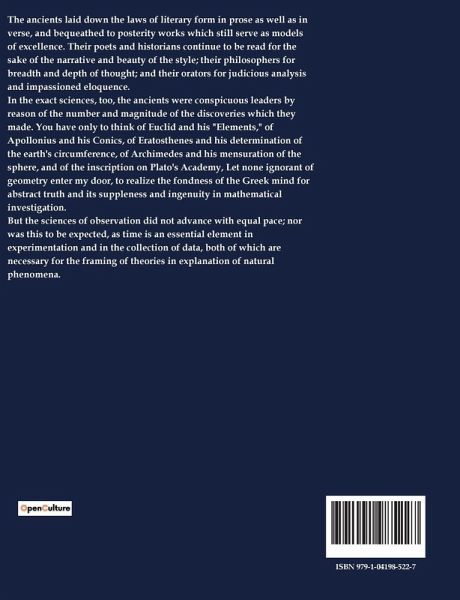 The ancients laid down the laws of literary form in prose as well as in verse, and bequeathed to posterity works which still serve as models of excellence. Their poets and historians continue to be read for the sake of the narrative and beauty of the style; their philosophers for breadth and depth of thought; and their orators for judicious analysis and impassioned eloquence. In the exact sciences, too, the ancients were conspicuous leaders by reason of the number and magnitude of the discoveries which they made. You have only to think of Euclid and his "Elements," of Apollonius and his Conics, of Eratosthenes and his determination of the earth's circumference, of Archimedes and his mensuration of the sphere, and of the inscription on Plato's Academy, Let none ignorant of geometry enter my door, to realize the fondness of the Greek mind for abstract truth and its suppleness and ingenuity in mathematical investigation. But the sciences of observation did not advance with equal pace; nor was this to be expected, as time is an essential element in experimentation and in the collection of data, both of which are necessary for the framing of theories in explanation of natural phenomena.