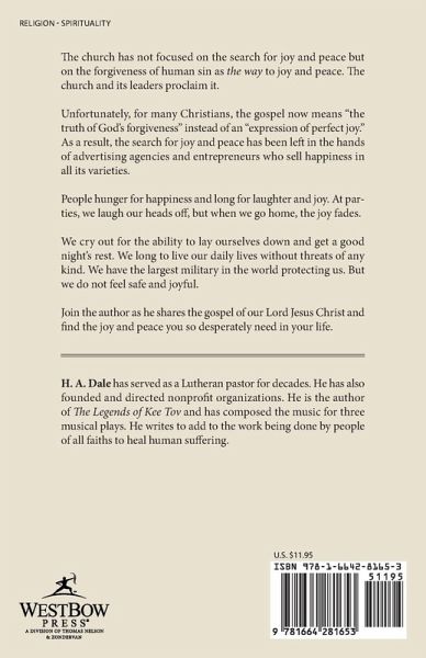 The church has not focused on the search for joy and peace but on the forgiveness of human sin as the way to joy and peace. The church and its leaders proclaim it. Unfortunately, for many Christians, the gospel now means "the truth of God's forgiveness" instead of an "expression of perfect joy." As a result, the search for joy and peace has been left in the hands of advertising agencies and entrepreneurs who sell happiness in all its varieties. People hunger for happiness and long for laughter and joy. At parties, we laugh our heads off, but when we go home, the joy fades. We cry out for the ability to lay ourselves down and get a good night's rest. We long to live our daily lives without threats of any kind. We have the largest military in the world protecting us. But we do not feel safe and joyful. Join the author as he shares the gospel of our Lord Jesus Christ and find the joy and peace you so desperately need in your life.