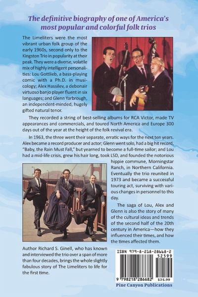 The Limeliters were the most vibrant urban folk group of the early 1960s, second only to the Kingston Trio in popularity at their peak. They were a diverse, volatile mix of highly intelligent personalities: Lou Gottlieb, a bass-playing comic with a Ph.D. in musicology; Alex Hassilev, a debonair virtuoso banjo player fluent in six languages; and Glenn Yarbrough, an independent-minded, hugely gifted natural tenor. They recorded a string of best-selling albums for RCA Victor, made TV appearances and commercials, and toured North America and Europe 300 days out of the year at the height of the folk revival era. In 1963, the three went their separate, erratic ways for the next ten years. Alex became a record producer and actor; Glenn went solo, had a big hit record, "Baby, the Rain Must Fall," but yearned to become a full-time sailor; and Lou had a mid-life crisis, grew his hair long, took LSD, and founded the notorious hippie commune, Morningstar Ranch, in Northern California. Eventually the trio reunited in 1973 and became a successful touring act, surviving with various changes in personnel to this day. The saga of Lou, Alex and Glenn is also the story of many of the cultural ideas and trends of the second half of the 20th century in America-how they influenced their times, and how the times affected them. Author Richard S. Ginell, who has known and interviewed the trio over a span of more than four decades, brings the whole slightly fabulous story of The Limeliters to life for the first time.