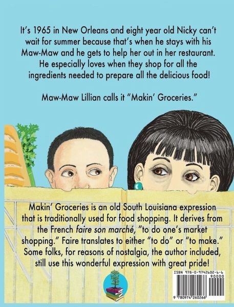 It's 1965 in New Orleans and eight year old Nicky can't wait for summer because that's when he stays with his Maw-maw and he gets to help her out in her restaurant. He especially loves when they shop for all the ingredients needed to prepare all the delicious food! Maw-Maw Lillian calls it "Makin' Groceries." Makin' Groceries is an old South Louisiana expression that is traditionally used for food shopping. It derives for the French faire son marche, "to do one's market shopping." Faire translates to either "to do" or "to make." Some folks, for reasons of nostalgia, the author included, still use this wonderful expression with great pride!…mehr