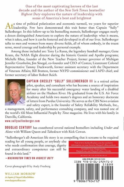 One of the most captivating heroes o f the last decade and the author o f the New York Times bestseller Highest Duty explores the nature o f leadership with some of America's best and brightest At a time of political polarization and economic turmoil, we yearn for superior leadership. Few have demonstrated this trait better than Captain "Sully" Sullenberger. In this follow-up to his bestselling memoir, Sullenberger engages nearly a dozen distinguished Americans to explore the nature of leadership: what it means, what it takes, and how it can be fostered and developed in all of our lives. Sullenberger talks to men and women from many diverse fields, all of whom embody, in the truest sense, moral courage and leadership by personal example. Among those included are: Tony La Russa, the legendary baseball manager; Gene Kranz, the NASA flight director during the historic Gemini and Apollo programs; Michelle Rhee, founder of the New Teacher Project; former governor of Michigan Jennifer Granholm; Jim Sinegal, co-founder and CEO of Costco; Lieutenant Colonel Representative Tammy Duckworth, former assistant secretary with the Department of Veterans Affairs; Bill Bratton, former NYPD commissioner and LAPD chief; and former secretary of labor Robert Reich.