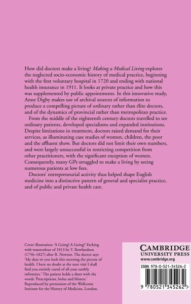 How did doctors make a living? Making a Medical Living explores the neglected socio-economic history of medical practice, beginning with the first voluntary hospital in 1720 and ending with national health insurance in 1911. It looks at public appointments in hospitals and dispensaries, office under public welfare systems, and at private practice. In this innovative study, Anne Digby makes use of new sources of information, looks at ordinary rather than élite doctors, and analyses provincial rather than metropolitan practice. From the mid-eighteenth century medicine became more commercialised; doctors travelled to see ordinary patients, developed specialisms, and were entrepreneurial in expanding institutional forms of health care. This entrepreneurial activity helped shape English medicine into a distinctive pattern of general and specialist practice, and of public and private health care.