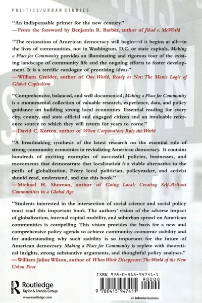 Forward: Benjamin BarberPreface: Toward the Reconstruction of American Community and DemocracyPart I.The triple Threat to Community and DemocracyIntroduction: The Case for Community Economic Stability: Economics and Political-Economics1.Globalization and Free trade2.The Chase for Jobs3.The Challenge of SprawlPart II.Place-Based Policy AlternativesNote to Part II4.Federal Job Stabilizing Policies5. Conventional Strategies6.State and Municipal Enterprise 7.Local MunicipalitiesPart III.Place-Based Economic StructuresNote to Part III8.Supporting Employee Ownership9.Community Development Corporations and Community Development Financial Institutions10. Alternative Ownership Models:Non-Profits and Co-Ops11. Community Land trusts and Community AgriculturePart IV. The Global ContextNote to Part IV.12.Restructuring Global Economic Institutions13.Alternative Approaches to TradeConclusion: Political-Economic Policies for the Next Stage of Democratic Development