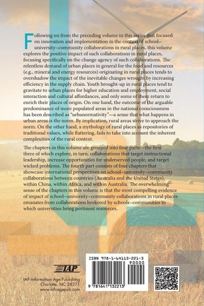 Following on from the preceding volume in this series that focused on innovation and implementation in the context of school-university-community collaborations in rural places, this volume explores the positive impact of such collaborations in rural places, focusing specifically on the change agency of such collaborations. The relentless demand of urban places in general for the food and resources (e.g., mineral and energy resources) originating in rural places tends to overshadow the impact of the inevitable changes wrought by increasing efficiency in the supply chain. Youth brought-up in rural places tend to gravitate to urban places for higher education and employment, social interaction and cultural affordances, and only some of them return to enrich their places of origin. On one hand, the outcome of the arguable predominance of more populated areas in the national consciousness has been described as "urbanormativity"-a sense that what happens in urban areas is the norm. By implication, rural areas strive to approach the norm. On the other hand, a mythology of rural places as repositories of traditional values, while flattering, fails to take into account the inherent complexities of the rural context. The chapters in this volume are grouped into four parts-the first three of which explore, in turn, collaborations that target instructional leadership, increase opportunities for underserved people, and target wicked problems. The fourth part consists of four chapters that showcase international perspectives on school-university-community collaborations between countries (Australia and the United States), within China, within Africa, and within Australia. The overwhelming sense of the chapters in this volume is that the most compelling evidence of impact of school-university-community collaborations in rural places emanates from collaborations brokered by schools-communities to which universities bring pertinent resources.