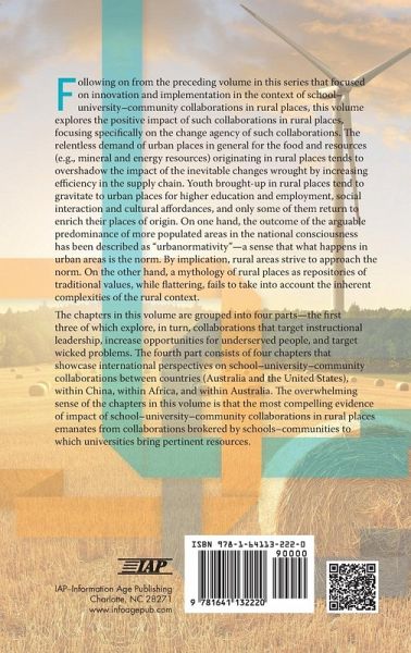 Following on from the preceding volume in this series that focused on innovation and implementation in the context of school-university-community collaborations in rural places, this volume explores the positive impact of such collaborations in rural places, focusing specifically on the change agency of such collaborations. The relentless demand of urban places in general for the food and resources (e.g., mineral and energy resources) originating in rural places tends to overshadow the impact of the inevitable changes wrought by increasing efficiency in the supply chain. Youth brought-up in rural places tend to gravitate to urban places for higher education and employment, social interaction and cultural affordances, and only some of them return to enrich their places of origin. On one hand, the outcome of the arguable predominance of more populated areas in the national consciousness has been described as "urbanormativity"-a sense that what happens in urban areas is the norm. By implication, rural areas strive to approach the norm. On the other hand, a mythology of rural places as repositories of traditional values, while flattering, fails to take into account the inherent complexities of the rural context. The chapters in this volume are grouped into four parts-the first three of which explore, in turn, collaborations that target instructional leadership, increase opportunities for underserved people, and target wicked problems. The fourth part consists of four chapters that showcase international perspectives on school-university-community collaborations between countries (Australia and the United States), within China, within Africa, and within Australia. The overwhelming sense of the chapters in this volume is that the most compelling evidence of impact of school-university-community collaborations in rural places emanates from collaborations brokered by schools-communities to which universities bring pertinent resources.