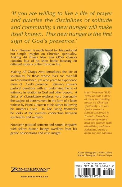 If you are willing to live a life of prayer and practice the disciplines of solitude and community, a new hunger will make itself known. This new hunger is the first sign of God's presence. Henri Nouwen is much loved for his profound but simple insight on Christian spirituality. Making All Things New and Other Classics contains four of his short books focusing on different aspects of the Christian life. Making All Things New introduces the life of spirituality for those whose lives are over-full and over-burdened, yet who yearn to experience more of God's presence. Intimacy answers pastoral questions with an underlying theme of intimacy in relation to God and other people. A Letter of Consolation explores very personally the subject of bereavement in the form of a letter by Henri Nouwen to his father following his mother's death. In The Living Reminder he looks at the seamless connection between spirituality and ministry. Nouwen's pastoral concern and natural empathy with fellow human beings overflow from his gentle observations and wise insight.