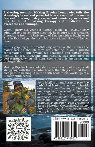 A riveting memoir, Making Bipolar Lemonade, tells the stunningly brave and powerful true account of one man's descent into major depressive and manic episodes and how he found lifesaving therapy and medication to overcome and triumph. When thirty-five-year-old John Medl is involuntarily admitted to a psychiatric hospital, he is sure it is a mistake. A graduate from the University of Dayton with a Bachelor of Arts in Psychology, John's life appears ideal. How did he get here? In this gripping and breathtaking narrative that makes the reader feel as though they are listening in on a private conversation, John reveals his delusions and battles with mental illness. Intriguing and riveting, this true story of perseverance, when all hope seems lost, is inspiring and unforgettable. Making Bipolar Lemonade shines as a beacon of hope for all struggling with their mental health that they can find their own path to healing. It is the sixth book in his Workings of a Bipolar Mind series. Get it Now!