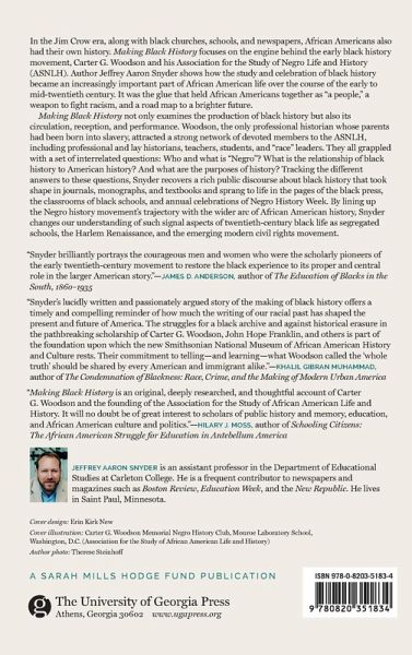 In the Jim Crow era, along with black churches, schools, and newspapers, African Americans also had their own history. Making Black History focuses on the engine behind the early black history movement, Carter G. Woodson and his Association for the Study of Negro Life and History (ASNLH). Author Jeffrey Aaron Snyder shows how the study and celebration of black history became an increasingly important part of African American life over the course of the early to mid-twentieth century. It was the glue that held African Americans together as "a people," a weapon to fight racism, and a roadmap to a brighter future. Making Black History takes an expansive view of the historical enterprise, covering not just the production of black history but also its circulation, reception, and performance. Woodson, the only professional historian whose parents had been born into slavery, attracted a strong network of devoted members to the ASNLH, including professional and lay historians, teachers, students, "race" leaders, journalists, and artists. They all grappled with a set of interrelated questions: Who and what is "Negro"? What is the relationship of black history to American history? And what are the purposes of history? Tracking the different answers to these questions, Snyder recovers a rich public discourse about black history that took shape in journals, monographs, and textbooks and sprang to life in the pages of the black press, the classrooms of black schools, and annual celebrations of Negro History Week. By lining up the Negro history movement's trajectory with the wider arc of African American history, Snyder changes our understanding of such signal aspects of twentieth-century black life as segregated schools, the Harlem Renaissance, and the emerging modern civil rights movement.