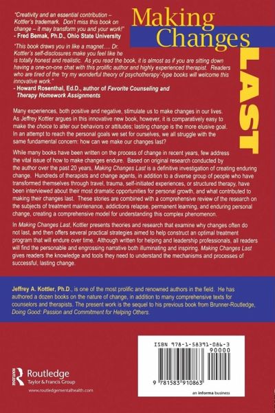 In an attempt to reach the personal goals we set for ourselves, we all struggle with the same fundamental concern: how can we make changes last? Based on original research conducted by the author over the past twenty years, Making Changes Last provides a definitive investigation of enduring change. Therapists and change agents, as well as a diverse group of people who have transformed themselves through travel, trauma, self-initiated experiences, or structured therapy, have been interviewed about their most dramatic personal changes and what contributed to making these changes last. Their stories are combined with a comprehensive review of the research on the subjects of treatment maintenance, addictions relapse, permanent learning, and personal change into a comprehensive model for understanding this complex phenomenon. Kottler then offers several practical strategies for constructing an optimal treatment program that will endure over time. Written for helping and leadership professionals, as well as the general public, Making Changes Last will give readers the knowledge and tools they need to understand the mechanisms fo successful, lasting change.
