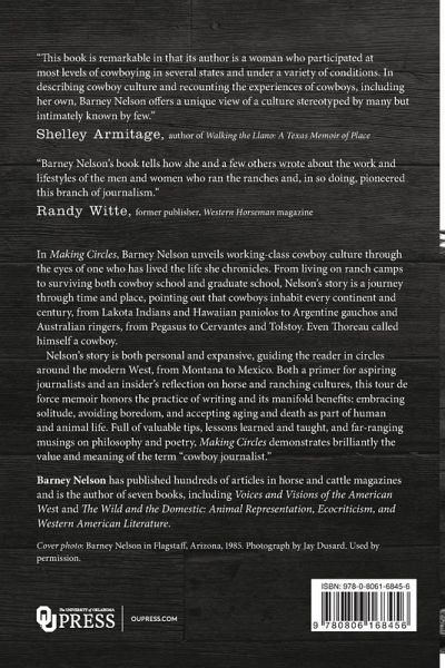 In Making Circles, Barney Nelson unveils working-class cowboy culture through the eyes of one who has lived the life she chronicles. From living on ranch camps to surviving both cowboy school and graduate school, Nelson's story is a journey through time and place, pointing out that cowboys inhabit every continent and century, from Lakota Indians and Hawaiian paniolos to Argentine gauchos and Australian ringers, from Pegasus to Cervantes and Tolstoy. Even Thoreau called himself a cowboy. Nelson's story is both personal and expansive, guiding the reader in circles around the modern West, from Montana to Mexico. Along the way, she celebrates the many characters she has encountered and considers role models. Unafraid to challenge the status quo, Nelson fearlessly defends embattled ranchers as well as the humanities, while speaking truth to the powerful forces of environmentalism, tourism, and urban voters. Both a primer for aspiring journalists and an insider's reflection on horse and ranching cultures, this tour de force memoir honors the practice of writing and its manifold benefits: embracing solitude, avoiding boredom, and accepting aging and death as part of human and animal life. Full of valuable tips, lessons learned and taught, and far-ranging musings on philosophy and poetry, Making Circles demonstrates brilliantly the value and meaning of the term "cowboy journalist."