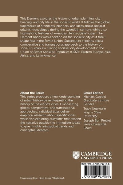 This Element explores the history of urban planning, city building, and city life in the socialist world. It follows the global trajectories of architects, planners, and ideas about socialist urbanism developed during the twentieth century.