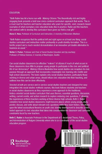 Can social studies classrooms be effective "makers" of citizens if much of what occurs in these classrooms does little to prepare young people to participate in the civic and political life of our democracy? Making Citizens illustrates how social studies can recapture its civic purpose through an approach that incorporates meaningful civic learning into middle and high school classrooms. The book explains why social studies teachers, particularly those working in diverse and urban areas, should infuse civic education into their teaching, and outlines how this can be done effectively. Directed at both pre-service and in-service social studies teachers and designed for easy integration into social studies methods courses, this book follows students and teachers in social studies classrooms as they experience a new approach to the traditional, history-oriented social studies curriculum, using themes, essential questions, discussion, writing, current events and action research to explore enduring civic questions. Following the experiences of three teachers working at three diverse high schools, Beth C. Rubin considers how social studies classrooms might become places where young people study, ponder, discuss and write about relevant civic questions while they learn history. She draws upon the latest sociocultural theories on youth civic identity development to describe a field-tested approach to civic education that takes into consideration the classroom and curricular constraints faced by new teachers.