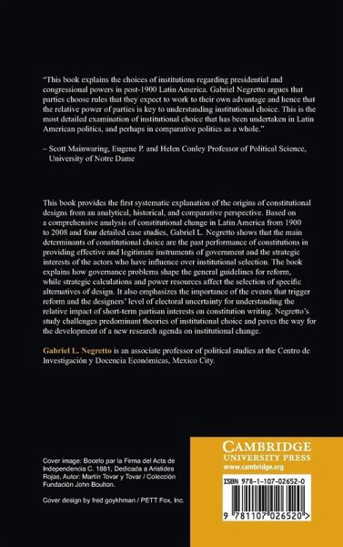 Negretto provides the first systematic explanation of the origins of constitutional designs from an analytical, historical and comparative perspective. Based on analysis of constitutional change in Latin America from 1900 to 2008 and four detailed case studies, Negretto shows the main determinants of constitutional choice are the past performance of constitutions in providing effective and legitimate instruments of government and the strategic interests of the actors who have influence over institutional selection. The book explains how governance problems shape the general guidelines for reform, while strategic calculations and power resources affect the selection of specific alternatives of design. It emphasizes the importance of events that trigger reform and the designers' level of electoral uncertainty for understanding the relative impact of short-term partisan interests on constitution writing. Negretto's study challenges predominant theories of institutional choice and paves the way for the development of a new research agenda on institutional change.
