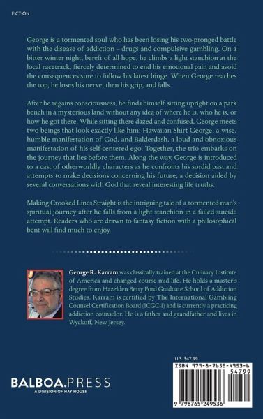 George is a tormented soul who has been battling the disease of addiction. On a bitter winter night, bereft of all hope, he climbs a light stanchion at the local racetrack, fiercely determined to end his emotional pain and avoid the consequences sure to follow his latest binge. When George reaches the top, he loses his nerve, then his grip, and falls. After he regains consciousness on a park bench in a mysterious land without any idea of where he is, who he is, or how he got there, George meets two beings that look exactly like him: Hawaiian Shirt George, a humble, wise manifestation of God who lives inside him, and Balderdash, his self-centered, narcissistic ego. Together, the trio embarks on the journey that lies before them. Along the way, George is introduced to a cast of characters as he confronts his sordid past and attempts to make decisions concerning his future. Several conversations with God reveal interesting life truths. Although God and his very dysfunctional family act as the conduit, it is ultimately up to George to choose what happens next. Making Crooked Lines Straight is the intriguing tale of a tormented man's spiritual journey after he falls from a light stanchion in a failed suicide attempt. Readers who are drawn to fantasy fiction with a philosophical bent will find much to enjoy.