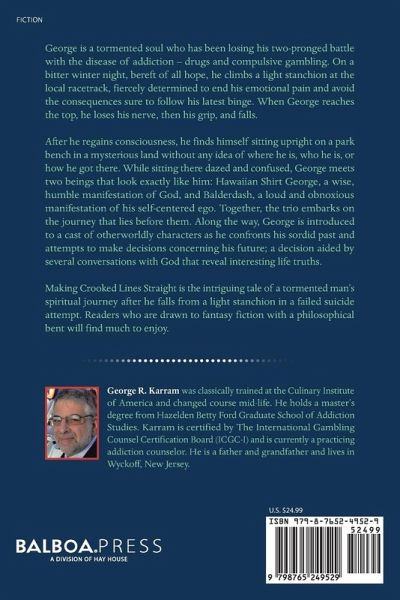 George is a tormented soul who has been battling the disease of addiction. On a bitter winter night, bereft of all hope, he climbs a light stanchion at the local racetrack, fiercely determined to end his emotional pain and avoid the consequences sure to follow his latest binge. When George reaches the top, he loses his nerve, then his grip, and falls. After he regains consciousness on a park bench in a mysterious land without any idea of where he is, who he is, or how he got there, George meets two beings that look exactly like him: Hawaiian Shirt George, a humble, wise manifestation of God who lives inside him, and Balderdash, his self-centered, narcissistic ego. Together, the trio embarks on the journey that lies before them. Along the way, George is introduced to a cast of characters as he confronts his sordid past and attempts to make decisions concerning his future. Several conversations with God reveal interesting life truths. Although God and his very dysfunctional family act as the conduit, it is ultimately up to George to choose what happens next. Making Crooked Lines Straight is the intriguing tale of a tormented man's spiritual journey after he falls from a light stanchion in a failed suicide attempt. Readers who are drawn to fantasy fiction with a philosophical bent will find much to enjoy.