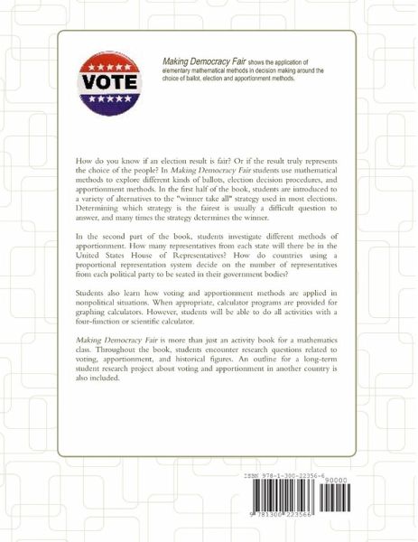 How do you know if an election is fair? Or if the result truly represents the choice of the people? In Making Democracy Fair students use elementary mathematical methods to explore different kinds of ballots, election decision procedures, and apportionment methods. In the first half of the book, students are introduced to a variety of alternatives to the "winner take all" strategy used in most elections. Determining which strategy is fairest is usually a very difficult question to answer, and many times the strategy chosen determines the winner. In the second part of the book, students investigate different methods of apportionment. How many representatives from each state will there be in the United States House of Representatives? How do countries using a proportional representation decide on the number of representatives from each political party to be seated in their government bodies?
