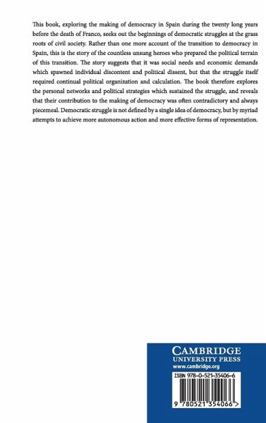This book, exploring the making of democracy in Spain during the twenty long years before the death of Franco, seeks out the beginnings of democratic struggles at the grass roots of civil society. Rather than one more account of the transition to democracy in Spain, this is the story of the countless unsung heroes who prepared the political terrain of this transition. The story suggests that it was social needs and economic demands which spawned individual discontent and political dissent, but that the struggle itself required continual political organization and calculation. The book therefore explores the personal networks and political strategies which sustained the struggle, and reveals that their contribution to the making of democracy was often contradictory and always piecemeal. Democratic struggle is not defined by a single idea of democracy, but by myriad attempts to achieve more autonomous action and more effective forms of representation.