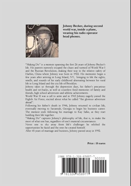 "Making Do" is a memoir spanning the first 26 years of Johnny Becker's life. His parents had narrowly escaped the chaos of World War I and the Russian Revolution making their way to the relative safety of Harbin, China where Johnny was born in 1922. His memories begin a few years after arriving in Long Island, NY. Johnny takes us through the depression days, high school adventures and athletic achievements. World War II was a call to arms and in 1943 Johnny eagerly joined the Eighth Air Force, before being shipped to England. After an intense four months and three missions over Germany, including a crash landing, his crew was shipped back to the states. Several months later, Johnny returned to civilian life and after working various jobs in NYC moved to Savannah, Georgia to begin his career in the Army and Navy Store business. "Making Do" captures Johnny's philosophy of life, that is, to make the most of what one has, regardless of one's material circumstances.