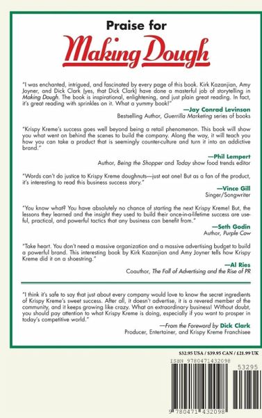 Praise for Making Dough "I was enchanted, intrigued, and fascinated by every page of this book. Kirk Kazanjian, Amy Joyner, and Dick Clark (yes, that Dick Clark) have done a masterful job of storytelling in Making Dough. The book is inspirational, enlightening, and just plain great reading. In fact, it's great reading with sprinkles on it. What a yummy book!" -Jay Conrad Levinson Bestselling Author, Guerrilla Marketing series of books "Krispy Kreme's success goes well beyond being a retail phenomenon. This book will show you what went on behind the scenes to build the company. Along the way, it will teach you how you can take a product that is seemingly counter-culture and turn it into an addictive brand." -Phil Lempert Author, Being the Shopper and Today show food trends editor "Words can't do justice to Krispy Kreme doughnuts-just eat one! But as a fan of the product, it's interesting to read this business success story." -Vince Gill Singer/Songwriter "You know what? You have absolutely no chance of starting the next Krispy Kreme! But, the lessons they learned and the insight they used to build their once-in-a-lifetime success are useful, practical, and powerful tactics that any business can benefit from." -Seth Godin Author, Purple Cow "Take heart. You don't need a massive organization and a massive advertising budget to build a powerful brand. This interesting book by Kirk Kazanjian and Amy Joyner tells how Krispy Kreme did it on a shoestring." -Al Ries Coauthor, The Fall of Advertising and the Rise of PR "I think it's safe to say that just about every company would love to know the secret ingredients of Krispy Kreme's sweet success. After all, it doesn't advertise, it is a revered member of the community, and it keeps growing like crazy. What an extraordinary business! Without doubt, you should pay attention to what Krispy Kreme is doing, especially if you want to prosper in today's competitive world." -From the Foreword by Dick Clark Producer, Entertainer, and Krispy Kreme Franchisee