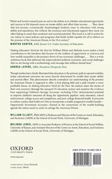 Making Education Work for the Poor identifies wealth inequality as the gravest threat to the endangered American Dream. Though studies have clearly illustrated that education is the primary path to upward mobility, today, educational outcomes are more directly determined by wealth than innate ability and exerted effort. This accounting directly contradicts Americans' understanding of the promise the American Dream is supposed to offer: a level playing field and a path towards a more profitable future. In this book, the authors share their own stories of their journeys through the unequal U.S. education system. One started from relative privilege and had her way to prosperity paved and her individual efforts augmented by institutional and structural support. The other grew up in poverty and had to fight against currents to complete higher education, only to find his ability to profit from that degree compromised by student debt. To directly counter wealth inequality and make education the 'great equalizer' that Americans believe it to be, this book calls for a revolution in financial aid policy, from debt dependence to asset empowerment. The book examines the evidence base supporting Children's Savings Accounts, including CSAs' demonstrated potential to improve children's outcomes all along the 'opportunity pipeline': early education, school achievement, college access and completion, and post-college financial health. It then outlines a policy that builds on CSAs to incorporate a sizable, progressive wealth transfer. This new policy, Opportunity Investment Accounts, is framed as the cornerstone of the wealth-building agenda the nation needs in order to salvage the American Dream. Written by leading CSA researchers, the book includes overviews of the major children's savings legislation proposed in Congress and the key features of prominent CSA programs in operation around the country today, as well as new qualitative and quantitative CSA research. The book ultimately presents a critical development of the theories that, together, explain how universal, progressive, asset-based education financing could make education work equitably for all American children.