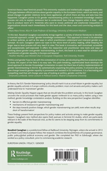 Rosalind Cavaghan presents a much needed fresh insight into the mechanisms maintaining the state's production of gender inequality, along with new perspectives on how we can tackle them. Making Gender Equality Happen argues that we must examine why so many policy makers can't understand how to 'mainstream gender'. To do this, Cavaghan develops a new methodological and theoretical perspective Gender Knowledge Contestation Analysis and applies it to examine how Gender Mainstreaming did, and did not, work in the EU's Science and Research policy. Findings provide fresh insights which help us to better understand and implement gender equality policies, in the changing European political context.