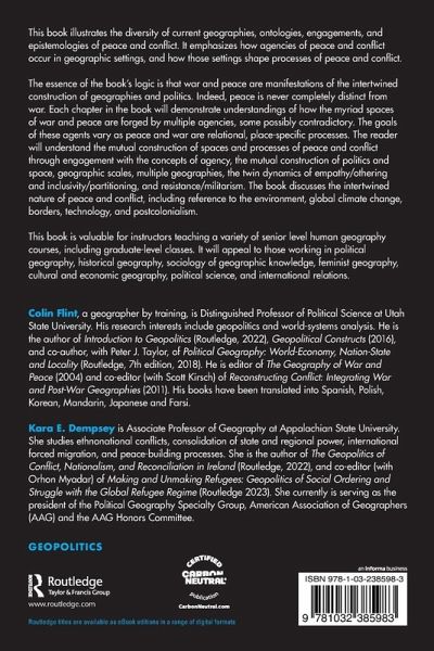 The essence of the book's logic is that war and peace are manifestations of the intertwined construction of geographies and politics. Indeed, peace is never completely distinct from war. Each chapter in the book will demonstrate understandings of how the myriad spaces of war and peace are forged by multiple agencies, some possibly contradictory. The goals of these agents vary as peace and war are relational, place-specific processes. The reader will understand the mutual construction of spaces and processes of peace and conflict through engagement with the concepts of agency, the mutual construction of politics and space, geographic scales, multiple geographies, the twin dynamics of empathy/othering and inclusivity/partitioning, and resistance/militarism. The book discusses the intertwined nature of peace and conflict, including reference to the environment, global climate change, borders, technology, and postcolonialism.