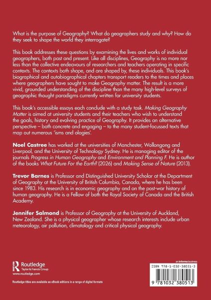 Noel Castree has worked at the universities of Manchester, Wollongong and Liverpool, and the University of Technology Sydney. He is managing editor of the journals Progress in Human Geography and Environment and Planning F . He is author of the books What Future For the Earth? (2025) and Making Sense of Nature (2013). Trevor Barnes is Professor and Distinguished University Scholar at the Department of Geography at the University of British Columbia, Canada, where he has been since 1983. His research is in economic geography and on the post-war history of human geography. He is both a Fellow of the Royal Society of Canada and the British Academy. Jennifer Salmond is Professor Physical Geography at the University of Auckland, New Zealand. She is a physical geographer whose research interests include urban meteorology, air pollution, climatology and critical physical geography.