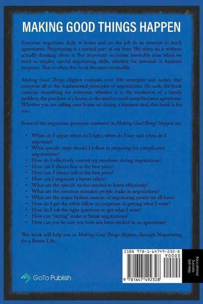 MAKING GOOD THINGS HAPPEN Everyone negotiates daily at home and on the job in an attempt to reach agreements. Negotiating is a natural part of our lives. We often do it without actually thinking about it. But important occasions inevitably arise when we need to employ special negotiating skills, whether for personal or business purposes. That is when this book becomes invaluable. Making Good Things Happen contains over 300 strategies and tactics that comprise all of the fundamental principles of negotiations. As such, the book contains something for everyone, whether it is the resolution of a family problem, the purchase of a home, or the need to reach some business agreement. Whether you are selling your home or closing a business deal, this book is for you. Some of the important questions answered in Making Good Things Happen are: ¿ When do I argue; when do I fight; when do I sue; and when do I negotiate? ¿ What specific steps should I follow in preparing for complicated negotiations? ¿ How do I effectively control my emotions during negotiations? ¿ How can I always buy at the best price? ¿ How can. I always sell at the best price? ¿ How can I negotiate a better salary? ¿ What are the specific tactics needed to listen effectively? ¿ What are the common mistakes people make in negotiations? ¿ What are the major hidden sources of negotiating power we all have? ¿ How do I get the other fellow to cooperate in getting what I want? ¿ How do I ask the right questions to get what I want? ¿ How can "timing" make or break negotiations? ¿ How can you be sure you have not been tricked in an agreement? This book will help you in Making Good Things Happen, through Negotiating for a Better Life.