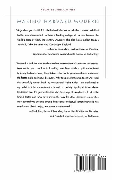 Making Harvard Modern is a candid, richly detailed portrait of America's most prominent university from 1933 to the present: seven decades of dramatic change. Early twentieth century Harvard was the country's oldest and richest university, but not necessarily its outstanding one. By the century's end it was widely regarded as the nation's, and the world's, leading institution of higher education. With verve, humor, and insight, Morton and Phyllis Keller tell the story of that rise: a tale of compelling personalities, notable achievement and no less notable academic pratfalls. Their book is based on rich and revealing archival materials, interviews, and personal experience. Young, humbly born James Bryant Conant succeeded Boston Brahmin A. Lawrence Lowell as Harvard's president in 1933, and set out to change a Brahmin-dominated university into a meritocratic one. He hoped to recruit the nation's finest scholars and an outstanding national student body. But the lack of new money during the Depression and the distractions of World War Two kept Conant, and Harvard, from achieving this goal. In the 1950s and 1960s, during the presidency of Conant's successor Nathan Marsh Pusey, Harvard raised the money, recruited the faculty, and attracted the students that made it a great meritocratic institution: America's university. The authors provide the fullest account yet of this transformation, and of the wrenching campus crisis of the late 'sixties. During the last thirty years of the twentieth century, a new academic culture arose: meritocratic Harvard morphed into worldly Harvard. During the presidencies of Derek Bok and Neil Rudenstine the university opened its doors to growing numbers of foreign students, women, African- and Asian-Americans, and Hispanics. Its administration, faculty, and students became more deeply engaged in social issues; its scientists and professional schools were more ready to enter into shared commercial ventures. But worldliness brought its own conflicts: over affirmative action and political correctness, over commercialization, over the ever higher costs of higher education. This fascinating account, the first comprehensive history of a modern American university, is essential reading for anyone with an interest in the present state and future course of higher education.