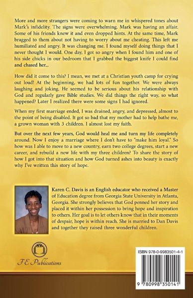 More and more strangers were coming to warn me in whispered tones about Mark's infidelity. The signs were overwhelming. Mark was having an affair. Some of his friends knew it and even dropped hints. At the same time, Mark bragged to them about not having to worry about me cheating. This left me humiliated and angry. It was changing me. I found myself doing things that I never thought I would. One day, I got so angry when I found him and one of his side chicks in our bedroom that I grabbed the biggest knife I could find and chased her... How did it come to this? I mean, we met at a Christian youth camp for crying out loud! At the beginning, we had lots of fun together. We were always laughing and joking. He seemed to be serious about his relationship with God and regularly gave Bible studies. We did things the right way, so what happened? Later I realized there were some signs I had ignored at the time. When my first marriage ended, I was drained, angry, and depressed, almost to the point of being disabled. It got so bad that my mother had to help bathe me, a grown woman with 3 children. I almost lost my faith. But over the next few years, God would heal me and turn my life completely around. Now I enjoy a marriage where I don't have to "make him loyal." So how was I able to move to a new country, earn two college degrees, start a new career, and rebuild a new life with my three children? To share the story of how I got into that situation and how God turned ashes into beauty is exactly why I've written this story of hope.