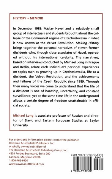 In December 1989, VOclav Havel and a relatively small group of intellectuals and students brought about the collapse of the communist regime of Czechoslovakia in what is now known as the Velvet Revolution. Making History: Czech Voices of Dissent and the Revolution of 1989 brings together the personal narratives of eleven former dissidents who, though close associates of Havel, operated without his international celebrity. The narratives, based on interviews conducted by the author in Prague and Berlin, relate each individual's personal experiences on topics such as growing up in Czechoslovakia, life as a dissident, the Velvet Revolution, and the achievements and failures of the Czech Republic since 1989. Through their many voices we come to understand that the life of a dissident is one of hardship, uncertainty, and constant surveillance; yet at the same time life in the underground allows a certain degree of freedom unattainable in official society. For more information about the book, please visit Michael Long's website.