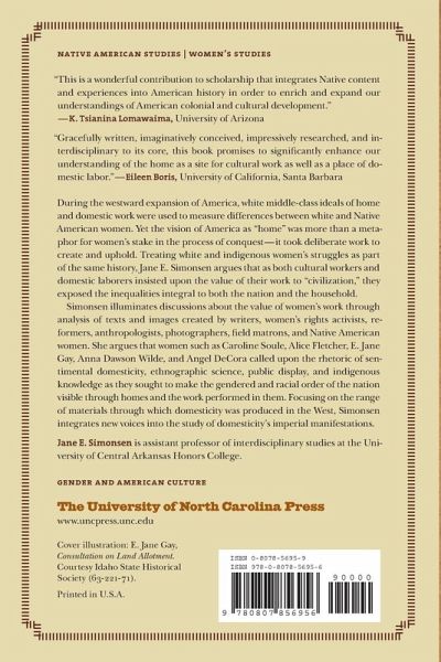 During the westward expansion of America, white middle-class ideals of home and domestic work were used to measure differences between white and Native American women. Yet the vision of America as “home” was more than a metaphor for women’s stake in the process of conquest — it took deliberate work to create and uphold. Treating white and indigenous women’s struggles as part of the same history, Jane E. Simonsen argues that as both cultural workers and domestic laborers insisted upon the value of their work to “civilization,” they exposed the inequalities integral to both the nation and the household. Simonsen illuminates discussions about the value of women’s work through analysis of texts and images created by writers, women’s rights activists, reformers, anthropologists, photographers, field matrons, and Native American women. She argues that women such as Caroline Soule, Alice Fletcher, E. Jane Gay, Anna Dawson Wilde, and Angel DeCora called upon the rhetoric of sentimental domesticity, ethnographic science, public display, and indigenous knowledge as they sought to make the gendered and racial order of the nation visible through homes and the work performed in them. Focusing on the range of materials through which domesticity was produced in the West, Simonsen integrates new voices into the study of domesticity’s imperial manifestations.