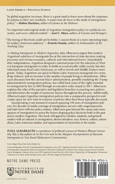 In Making Immigrants in Modern Argentina, Julia Albarracín argues that modern Argentina's selection of immigrants lies at the intersection of state decision-making processes and various economic, cultural, and international factors. Immediately after independence, Argentina designed a national project for the selection of Western European immigrants in order to build an economically viable society, but also welcomed many local Latin Americans, as well as Jewish and Middle Eastern immigrants. Today, Argentines are quick to blame Latin American immigrants for crime, drug violence, and an increase in the number of people living in shantytowns. Albarracín discusses how the current Macri administration, possibly emulating the Trump administration's immigration policies, has rolled back some of the rights awarded to immigrants by law in 2003 through an executive order issued in 2017. Albarracín explains the roles of the executive and legislative branches in enacting new policies and determines the weight of numerous factors throughout this process. Additionally, Albarracín puts Argentine immigration policies into a comparative perspective and creates space for new ways to examine countries other than those typically discussed. Incorporating a vast amount of research spanning 150 years of immigration policies, five decades of media coverage of immigration, surveys with congresspersons, and interviews with key policy makers, Albarracín goes beyond the causes and consequences of immigration to assess the factors shaping policy decisions both in the past and in modern Argentina. This book will appeal to scholars, students, and general readers with an interest in immigration, democratization, race, history, culture, nationalism, Latin American studies, and representation of minorities in the media.