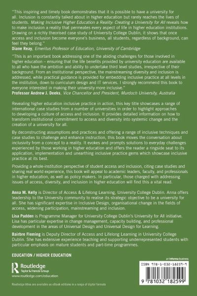 This is an important book addressing one of the abiding challenges for those involved in higher education - ensuring that the life benefits provided by university education are available to all who have the ambition and ability to undertake third level studies, irrespective of their background. From an institutional perspective, the mainstreaming diversity and inclusion is addressed, while practical guidance is provided for embedding inclusive practice at all levels in the institution, down to curriculum design and IT services. I strongly recommend this book to everyone interested in making their university more inclusive.