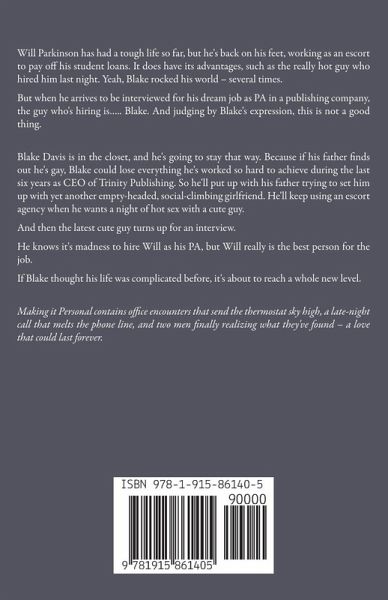 Will Parkinson has had a tough life so far, but he's back on his feet, working as an escort to pay off his student loans. It does have its advantages, such as the really hot guy who hired him last night. Yeah, Blake rocked his world – several times. But when he arrives to be interviewed for his dream job as PA in a publishing company, the guy who's hiring is….. Blake. And judging by Blake's expression, this is not a good thing. Blake Davis is in the closet, and he's going to stay that way. Because if his father finds out he's gay, Blake could lose everything he's worked so hard to achieve during the last six years as CEO of Trinity Publishing. So he'll put up with his father trying to set him up with yet another empty-headed, social-climbing girlfriend. He'll keep using an escort agency when he wants a night of hot sex with a cute guy. And then the latest cute guy turns up for an interview. He knows it's madness to hire Will as his PA, but Will really is the best person for the job. If Blake thought his life was complicated before, it's about to reach a whole new level. Making it Personal contains office encounters that send the thermostat sky high, a late-night call that melts the phone line, and two men finally realizing what they've found – a love that could last forever.