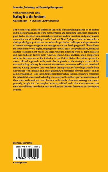 Nanotechnology, as shortly described as the study of manipulating matter on an atomic and molecular scale, is one of the most dynamic and promising industries, receiving a great deal of attention from researchers, business leaders, investors, and policymakers around the world. In Making It to the Forefront, Nesli Aydogan-Duda has assembled a distinguished group of authors to analyze the particular challenges and opportunities of nanotechnology emergence and management in the developing world. In so doing, they address the issues from several angles, ranging from cultural issues to capital markets, industrial clusters to government policy and legal structure. Drawing from in-depth research and case studies in Turkey, Latin America, India, China, and Iran, and a comparison with the development of the industry in the United states, the authors present a cross-cultural approach, with particular emphasis on the strategic nature of the nanotechnology industry for economic development, consumer welfare, and homeland security. Among the topics they consider are the importance of knowledge transfer from universities to the market and, more generally, the interface between science and its commercialization-and the institutional infrastructure that is necessary to maximize the potential of science and technology. In doing so, the authors provide unprecedented theoretical and empirical contributions to the study of nanotechnology, and, more generally, insight into the complex business, political, and cultural environment that must be established in order for such an industry to thrive in the context of a developing country.