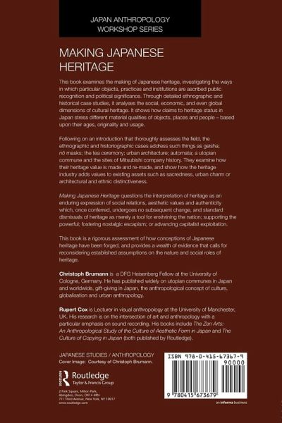 Introduction Part 1: Performing Japaneseness through Heritage 1. Making 'Japanese' Tea 2. Before Making Heritage: Internationalisation of Geisha in the Meiji Period 3. Making Art in the Japanese Way: Nihonga as Process and Symbolic Action Part 2: Institutionalising Japanese Heritage 4. Architecture, Folklore Studies, and Cultural Democracy: Nagakura Saburô and Hida Minzoku-mura 5. Nô Masks on Stage and in Museums: Approaches to the Contextualisation and Conservation of the Pitt Rivers Museum Nô Mask Collection 6. Company Culture or Patinated Past? The Display of Corporate Heritage in Sumitomo Part 3: Japanese Local Heritage and the Wider World 7. A Heady Heritage: The Shifting Biography of Kashira (Puppet Heads) as Cultural Heritage Objects in the Awaji Tradition 8. The Case of the Sash: A Search for Context in Okinawa 9. Houses in Motion: The Revitalization of Kyoto's Architectural Heritage 10. Automated Alterities: Movement and Identity in the History of the Japanese Kobi Ningyô Part 4: Perpetuating Japanese Heritage 11. Maintaining a Zen Tradition in Japan: The Concrete Problem of Priest Succession 12. Debating the Past to Determine the Future in Shinkyo, a Japanese Commune