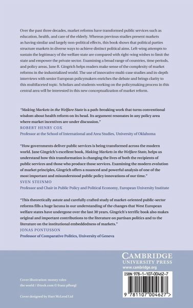 Over the past three decades, market reforms have transformed public services such as education, health, and care of the elderly. Whereas previous studies present markets as having similar and largely non-political effects, this book shows that political parties structure markets in diverse ways to achieve distinct political aims. Left-wing attempts to sustain the legitimacy of the welfare state are compared with right-wing wishes to limit the state and empower the private sector. Examining a broad range of countries, time periods, and policy areas, Jane R. Gingrich helps readers make sense of the complexity of market reforms in the industrialized world. The use of innovative multi-case studies and in-depth interviews with senior European policymakers enriches the debate and brings clarity to this multifaceted topic. Scholars and students working on the policymaking process in this central area will be interested in this new conceptualization of market reform.