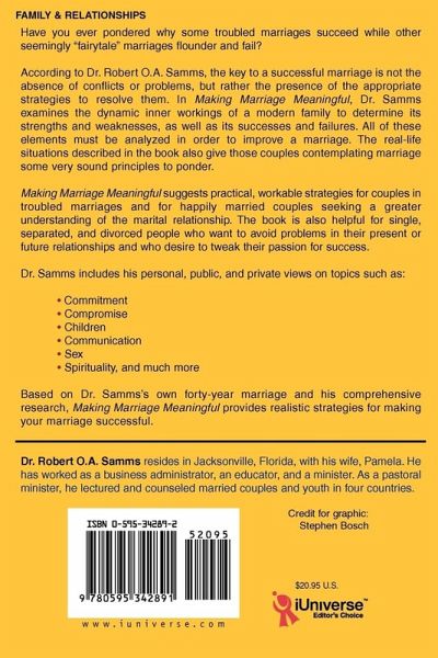 Have you ever pondered why some troubled marriages succeed while other seemingly 'fairytale" marriages flounder and fail? According to Dr. Robert O.A. Samms, the key to a successful marriage is not the absence of conflicts or problems, but rather the presence of the appropriate strategies to resolve them. In Making Marriage Meaningful, Dr. Samms examines the dynamic inner workings of a modern family to determine its strengths and weaknesses, as well as its successes and failures. All of these elements must be analyzed in order to improve a marriage. The real-life situations described in the book also give those couples contemplating marriage some very sound principles to ponder. Making Marriage Meaningful suggests practical, workable strategies for couples in troubled marriages and for happily married couples seeking a greater understanding of the marital relationship. The book is also helpful for single, separated, and divorced people who want to avoid problems in their present or future relationships and who desire to tweak their passion for success. Dr. Samms includes his personal, public, and private views on topics such as: Commitment Compromise Children Communication Sex Spirituality, and much more Based on Dr. Samms's own forty-year marriage and his comprehensive research, Making Marriage Meaningful provides realistic strategies for making your marriage successful.
