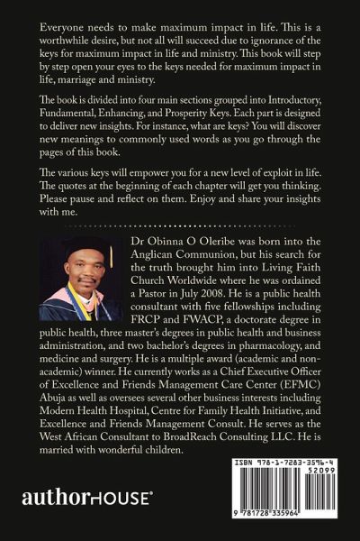 Everyone needs to make maximum impact in life. This is a worthwhile desire, but not all will succeed due to ignorance of the keys for maximum impact in life and ministry. This book will step by step open your eyes to the keys needed for maximum impact in life, marriage and ministry. The book is divided into four main sections grouped into Introductory, Fundamental, Enhancing, and Prosperity Keys. Each part is designed to deliver new insights. For instance, what are keys? You will discover new meanings to commonly used words as you go through the pages of this book. The various keys will empower you for a new level of exploit in life. The quotes at the beginning of each chapter will get you thinking. Please pause and reflect on them. Enjoy and share your insights with me.