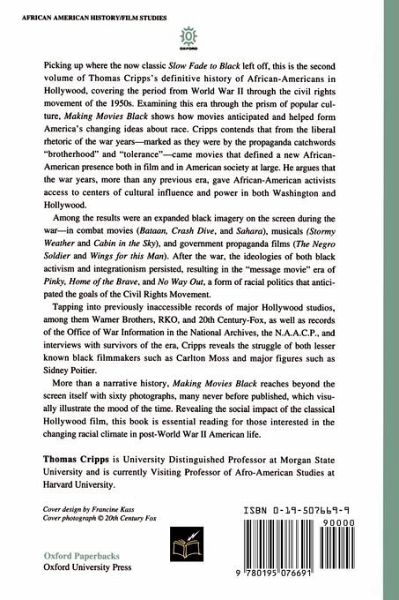 Cripps's Slow to Fade To Black: The Negro In American Film, 1900-1942, is considered the basic work on blacks' involvement in film, both in Hollywood and outside it. Making Movies Black continues the story up into the 1950s. It discusses the greater attention to black life in films of the early war years, including the all-black Cabin in The Sky, indicates the difficult time black leaders had with Hollywood studios in bringing pressure for better depictions of blacks on screen, describes the discovery of race-related subjects in such postwar films as Pinky and Intruder In The Dust, and depicts the rise of black stars like Sidney Poitier in Hollywood. As in Slow Fade to Black, these events are put into a broader social context.