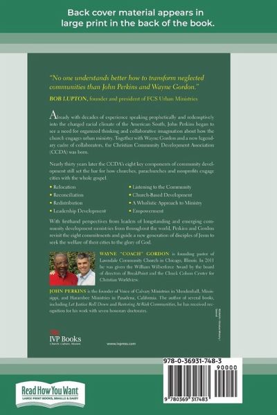 Already with decades of experience speaking prophetically into the charged racial climate of the American south, John Perkins began to see a need for organized thinking and collaborative imagination about how the church engages urban ministry. And so the Christian Community Development Association (CCDA) was born, with Wayne Gordon an immediate and enthusiastic participant. Nearly thirty years later CCDA's eight key components of community development still set the bar for how churches, parachurches and nonprofits engage cities with the whole gospel. Relocation Reconciliation Redistribution Leadership Development Listening to the Community Church - Based Development A Wholistic Approach to Ministry Empowerment In Making Neighborhoods Whole Perkins and Gordon revisit these eight commitments and how they've played out in real communities, even as they scan the horizon of urban ministry to set a new tone. With profiles of longstanding and emerging community development ministries, they guide a new conversation and empower disciples of Jesus to seek the welfare of their cities to the glory of God.