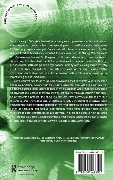 Michael Scott argues that New Zealand's pop music renaissance of the early 2000s was supported by state policies. He shows how the state built market opportunities for popular musicians through public-private partnerships and organisational affinity with existing music industry institutions. New Zealand offers an instructive case for the ways in which 'after neo-liberal' states steer and co-ordinate popular culture into market exchange by incentivising cultural production.