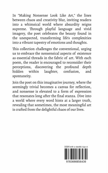 In "Making Nonsense Look Like Art," the lines between chaos and creativity blur, inviting readers into a whimsical world where absurdity reigns supreme. Through playful language and vivid imagery, the poet celebrates the beauty found in the unexpected, transforming life's complexities into a vibrant tapestry of emotions and thoughts. This collection challenges the conventional, urging us to embrace the nonsensical aspects of existence as essential threads in the fabric of art. With each poem, the reader is encouraged to reconsider their perceptions, discovering the profound depth hidden within laughter, confusion, and spontaneity. Join the poet on this imaginative journey, where the seemingly trivial becomes a canvas for reflection, and nonsense is elevated to a form of expression that resonates long after the final stanza. Dive into a world where every word hints at a larger truth, revealing that sometimes, the most meaningful art is crafted from the delightful chaos of our lives.