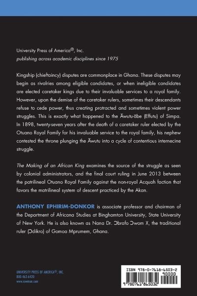 Kingship (chieftaincy) disputes are commonplace in Ghana. These disputes may begin as rivalries among eligible candidates, or when ineligible candidates are elected caretaker kings due to their invaluable services to a royal family. However, upon the demise of the caretaker rulers, sometimes their descendants refuse to cede power, thus creating protracted and sometimes violent power struggles. This is exactly what happened to the ¿wutu-¿be (Effutu) of Simpa. In 1898, twenty-seven years after the death of a caretaker ruler elected by the Otuano Royal Family for his invaluable service to the royal family, his nephew contested the throne plunging the ¿wutu into a cycle of contentious internecine struggle. The Making of an African King examines the source of the struggle as seen by colonial administrators, and the final court ruling in June 2013 between the patrilineal Otuano Royal Family against the non-royal Acquah faction that favors the matrilineal system of descent practiced by the Akan.
