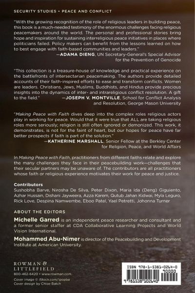 Michelle Garred is an independent peace researcher and consultant, and a former senior staffer at CDA Collaborative Learning Projects and World Vision International. Mohammed Abu-Nimer is director of the Peacebuilding and Development Institute at American University. In addition to his many articles and publications, Dr. Abu-Nimer is the co-founder and co-editor of the Journal of Peacebuilding and Development.